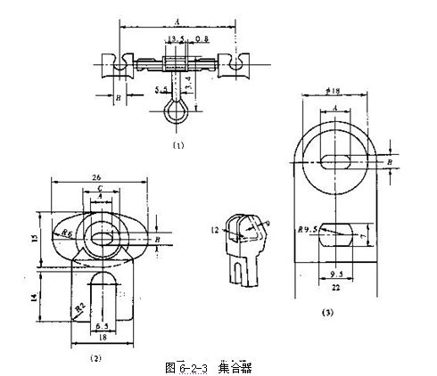 ⒈羅拉雙短皮圈牽伸裝置  三羅拉雙皮圈牽伸由三對羅拉組成兩個牽伸區,在主牽伸區設置有上、下皮圈,上、下銷,隔距塊,集合器等附加元件以加強對纖維運動的控制。后牽伸區為簡單羅拉牽伸或V型牽伸,起預牽伸的作用,為前區牽伸做好準備。粗紗機的牽伸元件結構、附加元件、加壓形式、清潔方式與細紗機基本相同,只是由于喂入須條較粗,所以在兩個牽伸區中均有集合器,其大小形狀與所處的牽伸區、輸出定量、喂入定量相適應,如圖6-2-3所示。前區集合器為雙錠并聯式,如圖中(1)所示,其口徑隨粗紗定量而定,見表6-2-1;中區集合器多采用上開口式,如圖中(2)所示;導條喇叭則為全封閉式,如圖中(3)