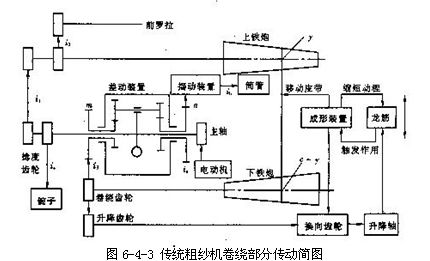 (一)粗紗機卷繞傳動系統的發展  國產粗紗機的發展主要體現在對卷繞傳動系統的改進上。過去粗紗機的卷繞傳動系統由機械式變速裝置、差動裝置、升降裝置、擺動裝置及成形裝置等組成,各機構間的內在聯系見圖6-4-3所示。其代表機型有A456、FA401、FA423、EJ521等。