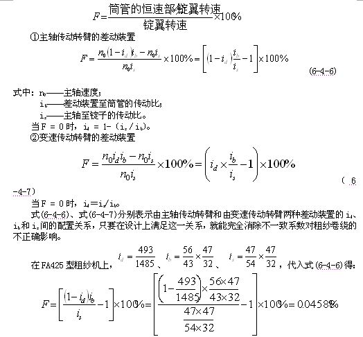 (2)差動裝置不一致系數的計算  由式(6-4-5)可知,筒管的速度由恒速部分和變速部分組成,恒速部分等于錠速,變速部分是卷繞速度,其變化規律和管紗的卷繞直徑成反比。如果筒管的恒速和錠速不等,其差值就要加入到卷繞速度中去。隨著卷繞速度逐層減慢,這個差值在卷繞速度中占的比例逐層增大,從而破壞了卷繞規律,引起卷繞張力的變化,增加了粗紗長片段不勻。筒管的恒速與錠速之差對錠速比值的百分率,稱為不一致系數F。當F=0時,說明卷繞規律正常;當F≠0時,則F的絕對值越大,卷繞規律的破壞越嚴重。兩類差動裝置不一致系數F的計算公式如下: