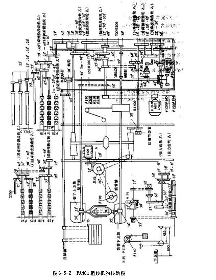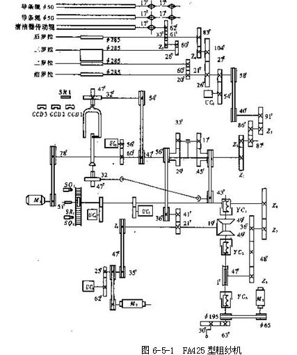⒉粗紗機的傳動系統  粗紗機的傳動系統因機型而異,現以由機電化向智能化的過渡機型——FA425型粗紗機為例,其傳動系統如圖6-5-1所示。
