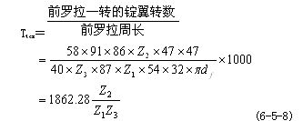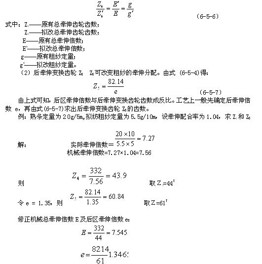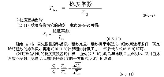 (1)總牽伸變換齒輪Z4  Z4與總牽伸倍數E成反比,欲求Z4時,先根據喂入棉條定量及擬紡粗紗定量,計算出所需的實際牽伸倍數,再用配合率求出機械牽伸倍數E,然后代入式(6-5-4 ) 中即可。在熟條定量不變的情況下,翻改紗特時,可按下式計算Z4: