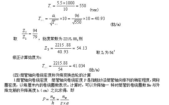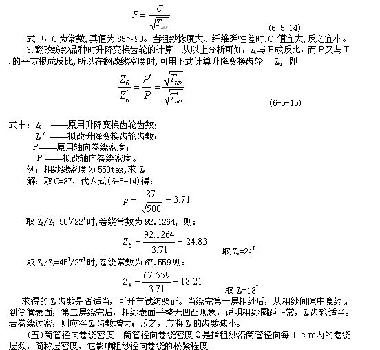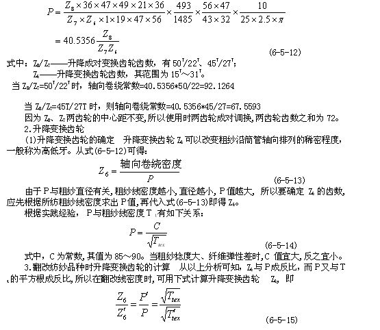 (3)升降齒輪  升降齒輪用于調節粗紗在筒管軸向排列的疏密程度,改變升降齒輪的齒數,即改變了升降龍筋的升降速度和粗紗的卷繞圈距。