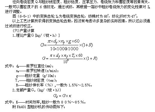 ⒊粗紗機的變換齒輪  為了保證粗紗的產質量,需根據機型特點和所紡品種對粗紗機進行工藝設計,設計的主要內容有牽伸倍數、捻系數和卷繞密度等。根據工藝設計對各種參數調整的需要,粗紗機上設有牽伸、捻度、卷繞、升降、成型和升降漸減等變換齒輪,使各參數具有一定的調整范圍。二十世紀生產的粗紗機機型很多,但其傳動系統中各變換齒輪的配置卻基本相同,故工藝計算方法也大同小異。在智能型粗紗機上,僅有牽伸變換齒輪,而其他工藝參數則可通過觸摸屏直接設定輸入。粗紗機的變換齒輪有:
