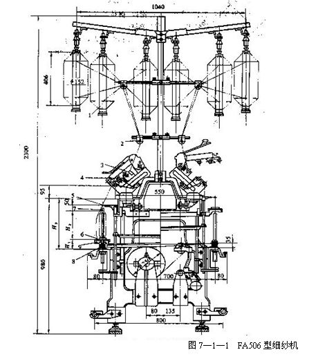 圖7—1—1為FA506型細紗機的示意圖,粗紗自吊錠上的粗紗管1退繞后,經導紗桿2、緩慢往復運動的橫動導紗喇叭3,喂入牽伸裝置4,牽伸后的須條由前羅拉輸出,經過導紗鉤5,穿過鋼絲圈6,卷繞到緊套在錠子8上的筒管7上,鋼絲圈每轉一轉,給須條加上一個捻回。鋼絲圈的轉速低于紗管的轉速,依靠鋼領板9的升降運動,使前羅拉輸出的須條按一定的成形要求有規律地卷繞到紗管上。