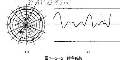 須條加捻時,產(chǎn)生了纖維的內(nèi)外層轉(zhuǎn)移。如圖7—3—2所示,設(shè)紗條截面上纖維根數(shù)為n,各根纖維與紗條輸出軸向的夾角為θi,在紡紗張力TS作用下,每根纖維受到張力Tisinθi,其軸向按平衡條件有  ∑Ticosθi=TS,其徑向產(chǎn)生向心壓力為Tisinθi,邊纖維θi大,Tisinθi大,中心纖維θi接近于0,Tisinθi接近于0。因此,從加捻三角區(qū)中纖維的幾何位置和紡紗張力所產(chǎn)生的力學(xué)條件迫使邊纖維擠向中心,把中心纖維擠向外緣。當(dāng)邊緣纖維擠入中心后,其向心壓力趨于零,又被另一些外緣纖維擠出來,一根纖維往往從外向內(nèi),又從內(nèi)到外,發(fā)生內(nèi)外層纖維反復(fù)轉(zhuǎn)移,因此,紗條中纖維的實際幾何形狀如圖7—3—3所示。圖(1)是紗條中一根纖維相隔0.2mm切片上各點橫截面投影。