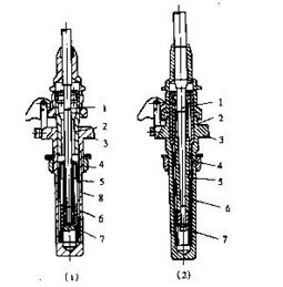 (1)分離式錠膽:如圖7—3—4(1)所示,上支承2由上軸承連同軸承座壓配在錠腳3中,錠底7裝配在中心套管5中,借彈性元件組合裝配在錠腳3內(nèi)。下支撐由中心套管5、彈性圈4、隔離圈8、圈簧6組成,安裝在錠腳3中。彈性圈的內(nèi)圈與中心套管緊密配合,外圈與錠腳保持較小間隙,起確定錠子中心和下支撐的橫向、縱向支撐作用。圈簧由彈簧鋼皮卷成,當(dāng)錠桿振動使下支撐偏離時能自調(diào)中心,同時利用各圈簧之間形成的多層油膜的粘性阻尼起到吸振作用。目前廣泛使用的這類錠子是D1200系列高速錠子,F(xiàn)A506型細(xì)紗機可配用該系列錠子。