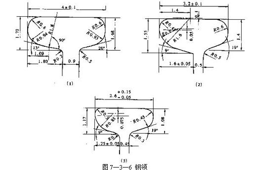 根據(jù)不同的紡紗要求,平面鋼領(lǐng)主要有三種,紡超細(xì)特紗和細(xì)特紗常用高速平面鋼領(lǐng)PGl/2型(邊寬2.6mm),其跑道由雙曲率半徑構(gòu)成,抗楔性能好,適應(yīng)高速;紡細(xì)特、中特紗常用高速平面鋼領(lǐng)PGl型(邊寬3.2mm),其跑道由多曲率半徑構(gòu)成,抗楔性能好;紡粗特紗用普通平面鋼領(lǐng)PG2型(邊寬4mm),其邊寬較寬,使用壽命較長。圖7—3—6為這三種平面鋼領(lǐng)的截面幾何形狀,圖(1)為PG2型鋼領(lǐng),圖(2)為PGl型鋼領(lǐng),圖(3)為PGl/2型鋼領(lǐng)。