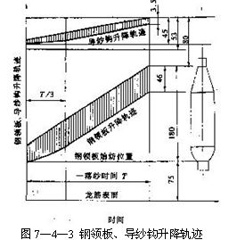 為了壓縮小紗氣圈高度以降低小紗張力,導紗鉤采用變動程升降,即從管紗始紡開始,導紗鉤的升降動程和級升量逐漸增大到正常值,如圖7—4—3所示。為此在輪10與11之間裝有位叉機構,位叉13叉在鏈條10'的一個橫銷14上,在小紗始紡時,迫使鏈條10'曲成折線,此時輪12的正反向往復轉動也造成位叉13的來回擺動,減少了輪11、12往復轉動的角度。由于級升運動將曲折的鏈條逐步拉直,在管紗成形三分之一時鏈條上的橫銷14與位叉13脫離,位叉不再起作用。這時,輪10帶動輪11、12牽吊導紗板作正常升降與級升運動。