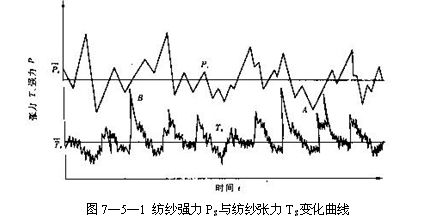 前羅拉到導紗鉤之間的紗段,一般稱紡紗段紗線。紡紗段紗線所具有的強力稱為紡紗強力。在紡紗過程中,如果紗線某截面處強力小于作用在該處的張力時,就發生斷頭,因此斷頭的根本原因是強力與張力的矛盾。如圖7—5—1所示為實測中號紗紡紗張力Ts和紡紗強力Ps的變化曲線。從圖中曲線可知,紡紗張力平均值Ts比紡紗強力平均值Ps小得多,斷頭機會是很少的。盡管紡紗張力與紡紗強力兩者各自按其本身規律波動,但大多數時間內并不一定發生斷頭。當某一瞬間,作用在紗線上某點張力大于該點的強力時,即發生斷頭(如圖中A、B點),這就說明斷頭主要發生在張力與強力兩者波動中波峰波谷交叉點,而不在于它的平均值大小。生產中平均張力總是比平均強力小,否則就無法進行生產。由于張力和強力存在波動,因此當紗線平均張力增加和平均強力降低,兩者數值靠近時,就會增加波峰波谷交叉機率,斷頭率也增加。如果張力、強力波動范圍小,特別是降低張力較高的波峰值或提高強力較低的波谷值,兩者的平均值即使靠近些,斷頭仍可穩定,甚至有可能減少。所以降低斷頭率的主攻方向是控制和穩定張力,提高紡紗強力、降低強力不勻率,尤其是減少突變張力和強力薄弱環節,以減少張力與強力波峰波谷交叉機率。