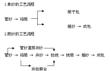 管紗 → 絡筒 → 并紗 → 捻線 → 線筒 → 燒毛 → 搖紗 → 成包