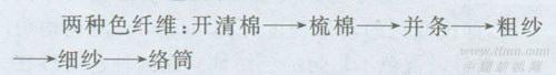 (a)雙色混紡,即兩種顏色的纖維混和紡紗,例如:麻灰紗。在雙色混紡紗中,還可分為:低比例色紡紗(色纖維≤10%),中比例色紡紗(40%≤色纖維≤10 %),高比例色紡紗(色纖維≥40%)。