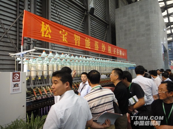 傳統的自動落紗機由于拔紗盤側向插入拔紗,對細紗錠子有損害等問題而令很多紡紗企業不愿采用。本屆展會上有江陰華方科技、銅陵松寶、無錫集聚三家企業展出了新型自動落紗機,引起參會觀眾的濃厚興趣,展示現場氣氛熱烈!