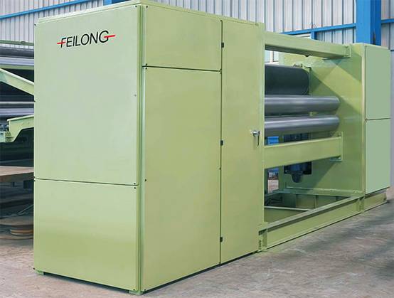 常熟市飛龍無紡機械有限公司展出FL-RZ熱軋機,這類熱軋機基本上用于表面粘合,相當于表面燙光機。結構上采用雙層輥筒,夾層內注有導熱油,并裝有電熱絲,采用碳刷給電熱絲供電。軋輥表面溫度最高為230℃,線壓力最高為500N/cm。軋輥升降有絲桿和液壓兩種方式。配置上有兩輥和三輥式,工作幅寬最寬為3.6m。