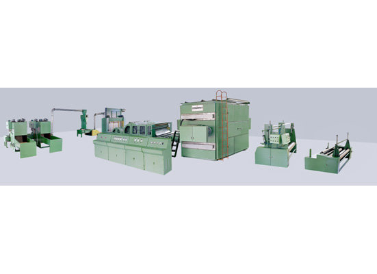 工藝流程: 一步法:開包混合開松→振動定量給棉→雙錫林雙道夫→寬幅高速梳理成網→熱風烘箱→自動成卷→分切 二步法:開松混棉→給棉→梳理→鋪網機→主梳理機→熱風烘箱→成卷機→→分切機