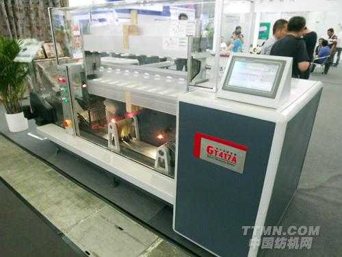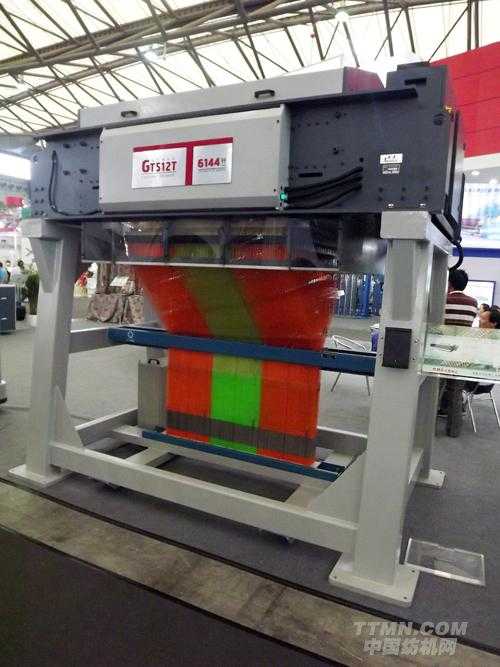展會上,該公司帶來了一款名為GT417A旋轉式高速電子多臂裝置的產品,該產品適用于各類高檔高速噴水、噴氣織機,是電子式控制的,最大循環緯數為12800緯,規格為16片,12mm間距。同在展臺上的還有另外一款GT512T高速電子提花機,它主要是用在噴氣、劍桿、片梭等無梭織機上,織造各種大提花織物的。提花針數為6144、8192、10240、12288、14336針,開口類型為復動式全清晰梭口,能夠適應各類噴氣及劍桿織機。