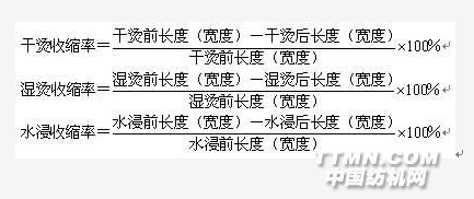 Ⅰ 實驗?zāi)康目椢镌谑艿剿蜐駸岬韧獠恳蛩氐拇碳ず螅w維從暫時平衡狀態(tài)轉(zhuǎn)到穩(wěn)定的平衡狀態(tài),在這個過程中發(fā)生了伸縮,其伸縮的程度就是伸縮率。通過實驗,測試織物分別受水和濕熱處理前后的尺寸變化,求得不同情況下織物的縮率。掌握織物縮率的測試方法,并了解織物產(chǎn)生收縮的原因。Ⅱ 實驗儀器和試樣實驗儀器:水箱、蒸汽熨斗、鋼尺、縫線、鉛筆等用具。試樣:機織物和針織物各兩塊。Ⅲ 實驗內(nèi)容材料縮率測試包括3個實驗內(nèi)容: 1. 干燙縮率實驗:織物在干燥情況下,用熨斗熨燙,使其受熱后產(chǎn)生收縮,測干燙縮率。 2. 濕燙縮率實驗:指將原料噴灑均勻的水霧,使之受潮后產(chǎn)生的回縮,測試織物濕燙縮率。 3. 水浸縮率實驗:又稱落水實驗,指讓織物完全浸泡在水里,給予充分吸濕而產(chǎn)生收縮,并測試織物的水浸縮率。 Ⅳ 實驗方法與步驟1、干燙縮率實驗:(1)采樣:在布匹的頭部或尾部除去1m以上,并除去布的兩道邊,取長度50cm作 為試樣。(2)根據(jù)不同織物的熨燙溫度條件,在試樣上熨燙15s后,待冷卻。(3)待涼透后,測試試樣長度和寬度,然后計算該織物的收縮率。2、濕燙縮率實驗:濕燙縮率實驗按工藝不同分為噴水熨燙測試法和蓋濕布熨燙測試法兩種。A、噴水熨燙測試法a. 采樣:在布匹的頭部或尾部除去1m以上,并除去布的兩道邊,取長度50cm×寬度50cm作為試樣。 b. 在試樣上用清水噴濕,注意水分分布要均勻,然后用熨斗在試樣上往復(fù)熨 燙,時間控制在熨干為宜,在測試時,溫度條件與干燙測試相同。 c. 待試樣晾干后,測量其長度和寬度,并計算收縮率。B、蓋濕布熨燙測試法a. 采樣:在布匹的頭部或尾部除去1m以上,并除去布的兩道邊,取長度50cm×寬度50cm作為試樣。b. 用一塊去漿的毛白平布清水浸透,并擰干備用。把濕布蓋在試樣上,按照溫度條件,用熨斗在試樣上來回熨燙,時間控制在蓋布熨干。 c. 待試樣晾
