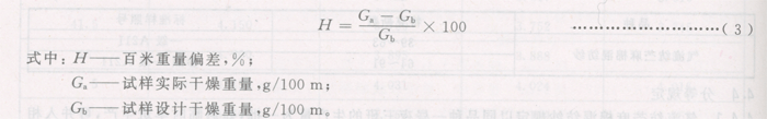 取10只筒子紗,每只筒子紗搖一塊黑板,每次共檢驗10塊黑板。. 5.3.3單紗斷裂強度及單紗斷裂強力變異系數CV(%)的試驗可與百米重量變異系數CV(%)、百米重量偏差用同一份試樣,每份試樣10個筒子紗,每個筒子紗測6次,總數為60次,采用全自動單紗強力試驗儀時,每份試樣10只筒子紗,每筒測10次,總數為100次,試驗報告應注明所用強力試驗儀類型。 5.3.4成包回潮率取樣 在每批紗每品種的成包中隨機抽取兩份試樣,每份抽取筒子紗不少于兩只,分別取紗的內層共取50 g左右,每批以兩份回潮率平均值表示。 5.4百米重量變異系數cv(%)和百米重量偏差的試驗方法按照GB/T 4743執行,百米重量偏差的計算見式(3)。