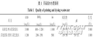 1 工程概況1·1 水質情況江蘇某染織實業有限公司是一家從事紗線到成 衣一條龍生產線的企業,設計規模為5 000 t/d,其 中包括800 t/d的漿染廢水和4 200 t/d的其他廢 水。在其排污口取樣多次,監測分析印染廢水水質 情況,詳見表1。其廢水的特點是:①污水中含大量染料分子, 可生化降解性差;②各股污水濃度及水量差異大;③ 染織廢水的水溫較高,通常為40℃左右,夏季達到 40℃以上,對生物處理不利;④色度變化大,原水pH 值偏堿。