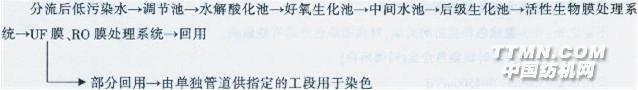 回用的成功要素:1)、認真分析水中污染物的成分、含量;2)、根據染色生產的用水要求來確定污水回用處理的工藝:3)、制訂的處理工藝要簡捷、操作方便及投資的合理與運行成本的節約;4)、合理地把回用水與總補給水量有機結合,做好全廠的用水平衡供應與處理。5)、回用處理外排濃水的再處理與排放等。3 回用項目實例:3.1 浙江某大型西裝面料企業(科德用戶)全廠用水量:3.5萬m3/d(兩個廠區)回用量:6500 m3/d回用成本:污水處理成本:1.1元/m3污水回用處理成本:0.8元/m3·d范圍:化纖、混紡面料的中深色染色生產用水處理工藝:分流后淺污染污水調節池→水解酸化池→好氧池(活性污泥法)→后(COD-800mg/L) (24h) (1 8h) (26h)