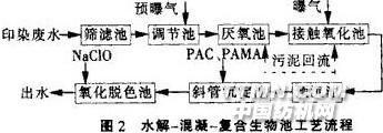 海城市中新印染廠采用該工藝處理印染廢水是成功的,水解、混凝處理可以降低廢水的pH值,提高廢水的可生化性,有利于后續(xù)的生物處理;混凝氣浮脫色使色度去除率達76.6%;復合生物池生物量大,運行穩(wěn)定,抗沖擊負荷強,對于可生化性較差的廢水有較好的去除效果:COD去除率90.5%,BOD去除率96.6%,工藝流程見圖2。