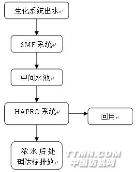 二、關(guān)鍵技術(shù)項(xiàng)目所采用的工藝技術(shù)是"(Flow-splitTM)SMF+HAPRO"組合膜處理技術(shù),其中(Flow-splitTM)SMF即膜-生物反應(yīng)器工藝(MBR工藝)的改型,是將膜生物反應(yīng)轉(zhuǎn)型的又一新型廢水處理技術(shù)。