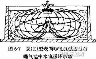泵(E)型葉輪是我國自行研制的高效表面曝氣葉輪。多年來廣泛應(yīng)用于石油化工、制革、印染、造紙、食品、農(nóng)藥和煤氣等行業(yè)以及城市污水的生物處理。 圖為泵(E)型表面曝氣機(jī)葉輪運(yùn)轉(zhuǎn)時(shí)曝氣池中水流循環(huán)示意。
