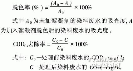 前言 近些年來隨著化纖織物的發(fā)展,仿真絲的興起和印染整理技術(shù)的進步,染料品種在日益增多的同 時,功能上亦朝著抗光解、抗氧化、抗生物氧化的方向發(fā)展,人工合成染料種類越來越多,結(jié)構(gòu)日趨復 雜,性能日趨穩(wěn)定,當前染料分子主要是以芳烴和雜環(huán)化合物為母體,并帶有顯色基團和極性基團, 難以脫色降解,從而使染料廢水處理難度加大。含水溶性染料,如活性染料、酸性染料等的廢水很難使用目前成熟的廢水處理工藝去除。因此,研究對這類染料有特效脫色功能的脫色劑是含染料廢水處理的一個重要方向[1-3]。 現(xiàn)有的脫色劑對于活性染料、分散染料等脫色效果較好,但對于酸性染料等水溶性好的染料脫色效果欠佳。染料大多為陰離子型,對可溶性染料, 陽離子型季銨鹽作為脫色劑是較好的選擇,且對其 它染料廢水的處理效果也較好。本文以陽離子型季銨鹽類絮凝劑BWD-01為脫色劑,處理不同類 型染料廢水,考察了廢水的脫色率以及COD去除率。配置模擬染料廢水所用的染料包括:毛皮藍MN-DR、毛尖藍TL-MV、毛皮紅BBA。