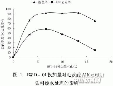 2 結(jié)果與討論 2. 1 BWD-01對毛皮藍MN-DR染料廢水的處理 2. 1. 1 BWD-01的投加量對廢水處理效果的影響B(tài)WD-01稀釋至10%用于試驗,模擬水樣濃 度為1. 0 g/L,測定吸光度的最大吸收波長為 416nm,結(jié)果如圖1。