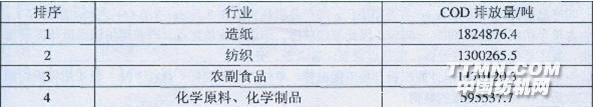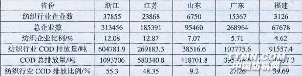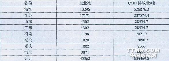 二、紡織行業主要問題 據全國第一次污染源普查,在39個行業中紡織行業排放COD量,已從第四位上升到第二位,全國39個行業共排放COD總量為7017081噸,紡織行業為1300265.5占18.53%。見表1;主要紡織大省排放量見表2;主要印染行業大省企業數及COD排放量見表3。 表1 主要行業COD排放量排序表.jpg)