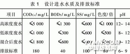 1 工程概況 某紡織印染有限公司是以棉坯布為主要加工 對象的大型棉紡印染企業(yè)。該廠主要生產(chǎn)工藝為:坯布→退漿→煮煉→絲光→染色→整理→成品。生產(chǎn)廢水分為高、低濃度兩部分,其中來自退漿、煮煉工序的高濃度廢水約為總水量的1/10,其 余為絲光、染色、整理等工序產(chǎn)生的低濃度廢水,設(shè) 計水量為2 000 m3/d。生產(chǎn)廢水中含有大量天然纖維本身所含的蠟質(zhì)、果膠、半纖維素以及織造過程中坯布上面的漿料、染色過程中剩余的染料以及相應 的助劑,屬于高濃度有機廢水。根據(jù)環(huán)保局要求,出水執(zhí)行《紡織染整工業(yè)水污染物排放標準》(GB 4287—92)二級標準。該工程設(shè)計進水水質(zhì)及排放標準見表1。