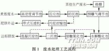 由表1可知,不同工序排放廢水水質(zhì)差異大,因 此需要對高濃度煮煉廢水部分先進行中和、混凝沉淀預處理,然后與其他生產(chǎn)廢水混合一并進行生化 處理。廢水BOD/COD<0.3,可生化性較差。由于廢水中染料等分子大多是難降解的有機物,單純采用好氧處理很難有效分解,應采取水解酸化工藝。為保證出水色度,還應在生化處理后加藥劑進一步脫色。因此最終確定采用水解酸化-接觸氧化-混凝沉淀工藝(見圖1)。