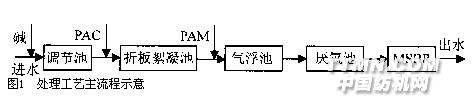 采用物化-生化組合處理工藝。物化部分采用混凝氣浮,生化部分采用厭氧和組合式MSBR反應(yīng)池。其工藝流程見圖1。