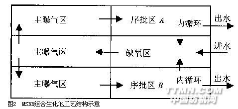 組合式生化反應(yīng)池共3組,采用鋼筋混凝土結(jié)構(gòu)。每組反應(yīng)池為一矩形水池,用隔墻分為缺氧區(qū),主曝氣區(qū),序批區(qū)(2個(gè))。工藝結(jié)構(gòu)見圖2。污水連續(xù)進(jìn)入缺氧區(qū)、主曝氣區(qū),然后進(jìn)入序批區(qū),兩個(gè)序批區(qū)交替充當(dāng)沉淀池周期運(yùn)行。若序批區(qū)?A沉淀出水,則序批區(qū)B 進(jìn)行缺氧、好氧和靜止沉淀等序批反應(yīng)。序批區(qū)B在進(jìn)行缺、好氧反應(yīng)的同時(shí),回流混合液進(jìn)入缺氧區(qū)與原污水混合。半個(gè)周期結(jié)束后,序批區(qū)A和序批區(qū)B的功能交換,剩余污泥在序批區(qū)沉淀出水的后期排放。