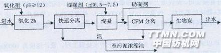 三、工藝及其討論為驗證工藝可靠性,試驗中把污染物去除和脫色作為主要指標進行考核,說明工藝可行性。1、反應條件工藝中,氧化時控制pH≥l2,時間為2h,運行證明,反應條件對處理效果有著較大影響。當pH≤11時,污染物的平均去除率小于20%,當pH≥l2時,則出現一個突躍,去除率達50%以上。加入氧化劑后,沉淀速度加快,脫色效果增加。為考察在不同pH值下的脫色效果,選取360nm處作為測定波長,測定處理前后的吸光值,按吸光值變化計算脫色率。見表3表3反應條件對脫色率影響
