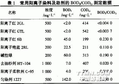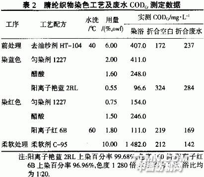 表l所示的是針織廠腈綸織物染色常用陽離子染料和助劑的BOD~/COD。測定數據.根據污染物降解評價標準【3】,當BODJCOD。為O.2~0.3時,降解速率較慢。微生物需經馴化,降解性差;當BODJCOD。2.2 染色工藝及廢水COD。 選擇了2種具有代表性的染色配方及實際生產工藝.首先測定陽離子藍2RL、陽離子紅6B的上染百分率,然后按染色工藝流程及升溫曲線對試樣進行前處理、染色、水洗和柔軟處理,同時按相同工藝配方做空白試驗.試驗中產生的廢水全部收集并分別實測各工序的空白和廢水COD。,最后按各工序用水量折合到總用水量的CODe.試驗結果見表2..jpg)