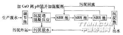 0 前言 江陰實益毛紡有限公司主要產品為各色腈綸地毯、毛毯。其工藝為先用陽離子染料將腈綸纖維(上海金山石化)染成各種顏色,然后再織成各種地毯、裝飾物等。所用的染料有:陽離子金黃X2GL、陽離子黃X28GL (上海染化三廠) ,陽離子紅X2GRL、陽離子藍X2GRRL (蘇州東吳染料廠) ;助劑有:表面活性劑1227、醋酸等。該廠1997年設計的污水處理裝置(生物濾池法)效果不好,加入活性污泥后處理的廢水也只能達到國家二級標準。國內外對陽離子染料廢水的研究主要集中在脫色[ 1, 2 ] ,而該廠廢水色度極低,個別研究COD去除率的工藝較復雜[ 3 ] ,不適應小企業。我們在不改變原有設施的基礎上,采用混凝+ SBR (間歇式活性污泥法)工藝,使出水指標穩定并達到一級標準[ 4 ] 。1 工藝設計1. 1 工藝流程