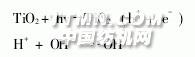 紡織印染染色廢水,水量大,色度高,成分復雜,廢水中含有染料、助劑、油劑、酸堿、纖維雜質及無機鹽等,隨著染料工業的發展,大量新型印染助劑、染料、漿料等難以生物降解的有機物在印染行業中的廣泛應用,致使印染廢水中有機物成分越來越復雜多變,其BOD5/CODCr比值下降,色度高,可生化性降低。消除印染廢水中高色度和高CODCr值,已成為長期困擾印染廢水治理的兩個關鍵問題[1]。目前國內處理印染廢水多以生化法為主,但存在處理效果不佳、CODCr和色度去除困難等缺點[2]。 近年來,隨著光化學及技術的發展和進步,利用TiO2氧化物多相光催化消除環境中的各種污染物的研究已引起人們的廣泛關注。我國是鈦礦儲量大國,具有豐富的鈦資源。TiO2以其廉價無毒、蝕性小、無二次污染等諸多優點,成為多相光催化領域的熱點,并被認為是當前最具有開發前景的綠色環保型光催化劑[3],已廣泛用于處理有機污染物[4,5]。但該方法目前主要處于實驗室試驗階段,用該法處理實際染料廢水的研究不多[6,7]。本文探究了TiO2光催化劑在實際印染廢水處理中的應用效果及其影響因素,為處理實際的印染廢水提供一種高效且經濟可行的方法。1 基本原理[8] 當能量相當于TiO2禁帶寬度的光照射到催化劑表面時,就會激發半導體內的電子從價帶躍遷至導帶,形成具有很強活性的電子一空穴對,并進一步誘導一系列氧化還原反應的進行。光生空穴具有很強的得電子的能力,可與催化劑表面吸附的OH-和H2O發生反應生成羥基自由基。
