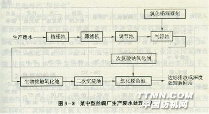 該廠廢水中有一定濃度的懸浮物,主要為絲綢纖維和化學纖維類污染物等。如果任其進入廢水生物處理單元,將既增加生化處理單元的負荷和降低處理效果,還造成了浪費。因為短纖維是造紙的理想原料,應該加以回收。為此,該廠在廢水預處理階段設置了格柵和篩網,以便通過物理法去除和回收大量短纖維。