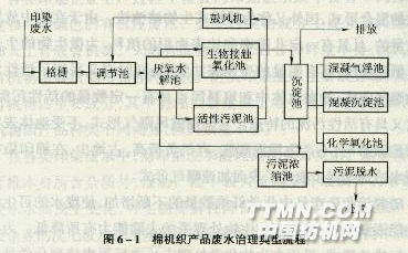 棉產品印染廢水整體屬于有機性廢水,而且具有城市污水、生活污水的某些特性,但其廢水的可生物降解性較差,并且還具有某些特殊顏色。早期采用較多的治理技術為生物治理技術中的活性污泥法,由于企業廢水治理量一般規模為2000—5000t/d,一般多采用表面加速曝氣形式。為了提高其處理效率,使運行更加穩定,又陸續開發了不同結構池型(圓形池、方形池)、不同工藝形式(合建式、分建式)的多種活性污泥法處理形式。由于當時棉紡印染產品主要以天然棉纖維為主,廢水可生物降解性能較好,因而處理后可獲得較為滿意的效果。隨后,引進當時國外先進環保治理技術并結合我國具體情況,開發出生物膜法的生物接觸氧化法、塔式生物濾池等生物轉盤法形式,并獲得較快的發展和應用。生物接觸氧化法實質上是生物膜法與活性污泥法的混合形式,國外又稱為浸沒式生物濾池法。由于在池中放置一定數量的、且具有一定孔隙率和比表面積的填料,為微生物的生長提供了棲息場所,具有明顯的生物膜法特點;同時它又采用了活性污泥法的曝氣方式,并在池體中和填料間也具有一定數量的活性污泥,因此它又具有活性污泥的特點。它采用鼓風曝氣形式,不受池體表面產生的泡沫影響,不產生污泥膨脹,有機負荷高,占地少,在棉印染行業的廢水治理中逐步取代了表面加速曝氣形式。 隨著棉印染產品中化學纖維數量的不斷增加,使廢水的可生物降解性能逐漸變差,使原有的生物處理系統去除能力有所降低。為了滿足達標排放要求,采用在生物化學處理方法之后再串接到化學處理的方式?;瘜W處理中以化學投藥法為主,主要采用混凝沉淀和混凝氣浮的形式。采用生化與物化聯合的治理工藝,可以充分發揮生物處理法去除大部分有機污染物的能力,而其剩余的有機污染物和色度則由化學處理法承擔,這樣可以減少藥劑投加量,使處理成本降低。 1. 棉機織產品印染廢水治理 處理工藝難以將其氧化分解,現在常采用厭氧一好氧生物治理工藝。其中的厭氧法