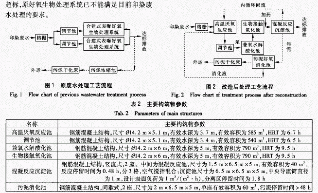 ①格柵利用原有格柵,主要去除廢水中漂浮物以及較大的固體物,防止其進入廢水處理設施,保證提升水泵和后續處理設施的正常運行。②高溫厭氧反應池由原東側污水調節池改建,高溫厭氧反應池利用人流廢水溫度較高的特點,進行高溫厭氧發酵預處理,以降低廢水中有機污染物的濃度,同時還可有效降低廢水的色度,改善廢水的可生化性。③調節池由原有西側污水調節池改建,廢水由高溫厭氧反應池經增設的連接管道自流進入,可以有效地調節水量和均衡水質,保證各個處理設備在設計水質和水量下正常運行。④兼氧水解酸化池由原西側曝氣池和沉淀