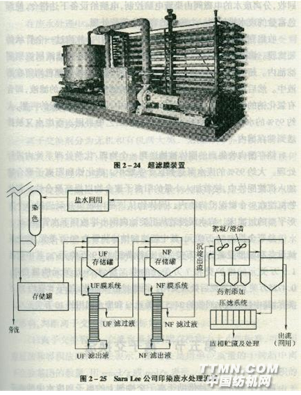 在這套裝置中安裝了超濾和納濾系統(tǒng),廢水處理能力為7.5一并將氯化鈉和凈水在染色工藝中再用。圖2—25是處理流程圖。350t/d。小型系統(tǒng)通過(guò)處理有色含鹽的廢水能有效地降低色度。這套設(shè)備有雙重排水管道系統(tǒng),可以在稀釋的主體廢水中進(jìn)行選擇性單獨(dú)回收,分離廢水的電磁閥由染液電腦控制,電腦給設(shè)備下達(dá)指令,使深色富鹽的廢水排放到一個(gè)獨(dú)立的容器中等待處理。
