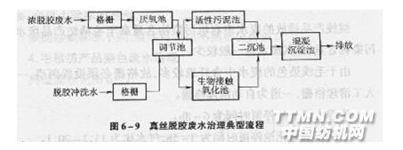 天然真絲綢產品廢水又分為脫膠廢水和印染廢水兩種。 (1)真絲脫膠廢水治理:絲脫膠廢水為較高濃度的有機性廢水,可生物降解性能較好。濃脫膠廢水的濃度指標一般COD為5000一10000mg/L,BOD5為2500—5000mg/L,pH值為9.0—9。5。一般脫膠高 濃度廢水水量較少,而脫膠沖洗水量較大,水質濃度較低,其COD為500—1000mg/L,BOD5為300一600mg/L。一般采用分質處理后再混合處理,或全部廢水直接混合后再進行處理,分質治理流程見圖6—9