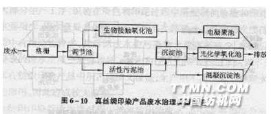 流程中格柵設置兩道,厭氧池采用UASB形式,停留時間為6一12h,采用常溫厭氧發酵,COD去除率達80%一85%。 調節池停留時間為6—8h。 生物接觸氧化池停留時間為4—6h,氣水比為18:1—20:1,一般采用二段法,COD去除率為60%左右。 活性污泥停留時間為8—10h,COD去除率為60%一65%。 二沉池沉淀時間為1.5—2h,通常采用豎流式。 (2)真絲綢印染產品廢水治理:天然真絲綢指以天然蠶絲為原料的各類產品,其廢水中除了天然絲綢上所含的蠟質及漿料外,主要為染料和助劑。 通常采用的治理流程見圖6—10。
