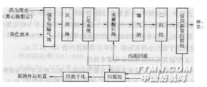 2.寧波某毛紡織有限公司廢水處理 (1)工程概述:寧波某毛紡織有限公司是一家以澳洲羊毛為原料,專業(yè)從事毛紡、染色、制衣的企業(yè)。生產(chǎn)廢水主要來自洗毛、染色工序。洗毛工序的羊毛洗凈率在70%以上,洗毛廢水中含有凈洗劑、堿等化學成分和大量羊毛脂、羊汗和泥沙等污染物,羊毛脂是造成廢水中COD和BOD的主要成分。染色廢水主要來自條染和匹染車間,工藝中使用的染料主要為酸性和分散染料,以及配套的染化助劑,廢水中污染物濃度相對較低。洗毛廢水主要來自耙式洗毛機第一、第二、第三槽,第四、第五槽較清潔的排水回流到前三槽進行逆流漂洗,每洗凈1t原毛耗水25—35m3,洗毛廢水平均排放量為200mS/d。條染、匹染車間排水為300mS/d。混合廢水量500mS/d。 該公司在20世紀90年代初建有一套廢水處理設施,采用溶氣氣浮(DAP)一混凝沉淀法處理,處理成本高,出水COD遠遠超過國家排脅準,被列入1999年寧波市市長目標限期治理責任制項目。后進行改造,采用渦凹氣浮(CAP)一水解酸化一活性污泥法工藝,在實際生產(chǎn)運行中取得了較好的效果。 。 (2)處理工藝流程:鑒于洗毛染色混合廢水屬于高濃度有機廢水,較適合采用物化生化聯(lián)合處理。考慮到洗毛、染色廢水中酸含量較高,且含有大量的羊毛脂、碎毛、洗劑等,宜先經(jīng)絮凝處理。經(jīng)試驗,最后確定了鋁鐵復合混凝劑和陰離子聚丙烯酰胺(PAM)作為絮凝劑,并根據(jù)同類工程實踐經(jīng)驗選用了CAF(渦凹氣浮)工藝作為物化處理單元,生化單元采用水解酸化一活性污泥工藝(見圖2—9)。