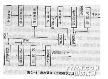 1.沈陽某印染廠印染廢水處理 該印染廠是生產平絨、燈芯絨等產品的骨干企業。年印染布產量1.1 x 107m,產值1800萬元,利稅32萬元,在生產過程中產生大量印染廢水,廢水量達2400m3/d,廢水中CODc~含量超出國家和遼寧省污水排放標準(DB 21—60一89)數倍,對沈陽市地下水源構成極大威脅。1984年列為沈陽市第一批環保治理項目。1985年工廠設計、制造、安裝一套以活性污泥法一氣浮法為主要工藝流程的廢水處理設施,經過調試、完善,現在已正常運轉九年多,廢水經過處理后能達標排放。(1)廢水來源和特點:該廠生產廢水主要是由退漿、煮練、漂白、染色、印花等工序排出廢水組成。廢水的特點:濃度和水量隨時間變化較大,很不穩定;廢水色度高、顏色隨時間變化大;廢水含有大量染料、漿料和助劑。該廠加工純棉制品,工藝以染色、印花為主。染料有硫化染料(占70%),還原染料、活性染料、不溶性偶氮染料(納夫妥)、涂料(占20~o)等。這些染料大部分屬芳香族苯環化合物,多數具有硝基(一N02)、氯基(一口)、氨基(一NH2)和羥基(一OH);漿料有淀粉、聚乙烯醇、海藻酸鈉;助劑有保險粉、滲透劑、表面活性劑(拉開粉、平平加)等。它們的可生化性相差很大。納夫妥較容易生物氧化,海藻酸鈉能夠被生物氧化,活性染料、聚乙烯醇難以生物氧化。該廠廢水CODo值高,BOD5與CODo比值為0.4,一般單一的生化處理不能達到國家及遼寧省排放標準。必須采用生化、物化組合技術處理。廢水處理設計規模為日處理廢水能力3100m3,最大小時處理量129m3(實際運行廢水量為100m3/h=2400m3/d)。進水水質:COD0cr為300--1200mg/L,BOD5為140—60mg/L,SS為200—400mg/L,pH值為6—11。 (2)處理工藝:工藝流程見圖2&md