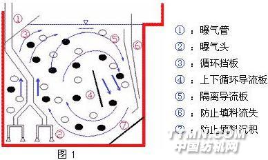 MBBR工藝原理是通過向反應(yīng)器中投加一定數(shù)量的懸浮載體,提高反應(yīng)器中的生物量及生物種類,從而提高反應(yīng)器的處理效率。由于填料密度接近于水,所以在曝氣的時(shí)候,與水呈完全混合狀態(tài),微生物生長的環(huán)境為氣、液、固三相。載體在水中的碰撞和剪切作用,使空氣氣泡更加細(xì)小,增加了氧氣的利用率。另外,每個(gè)載體內(nèi)外均具有不同的生物種類,內(nèi)部生長一些厭氧菌或兼氧菌,外部為好養(yǎng)菌,這樣每個(gè)載體都為一個(gè)微型反應(yīng)器,使硝化反應(yīng)和反硝化反應(yīng)同時(shí)存在,從而提高了處理效果。