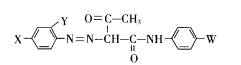 (1)黃色譜主要是以乙酰乙酰芳胺為偶合組份,重氮組份若為DCB即為非環保顏料,環保型的重氮組份是由各種非涉嫌致癌芳胺組成,偶合后即為環保型黃色有機顏料。通式如下,品種如表l[2]。