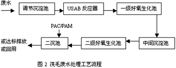 2.1 工藝的確定 洗毛廢水是洗毛生產工藝排出的高濃度有機廢水,其中含有泥沙、羊毛脂、羊糞,還含有少量洗滌劑和羊毛纖維。經化驗分析證明:廢水中羊毛脂多已乳化,以O/W(水包油)形式存在,是組成廢水中BOD5,CODcr的主要成分。其色淡黃、味臭、粘稠、pH值為8.5~9.5,m(BOD5)/m(CODcr)為0.6左右。 根據以上廢水特點,采用厭氧、好氧加混凝沉淀的處理工藝。由于廢水中高濃度的CODcr,BOD5主要是由羊毛脂引起(該廠廢水中羊毛脂含量少,回收價值不大),羊毛脂的化學成分為脂肪酸和高級一元醇化合而成的脂。故先采用厭氧降解高分子物質,而后再用好氧生化,利用好氧微生物的新陳代謝作用去除水中的色度。氣味、粘稠物質等??紤]該公司管理水