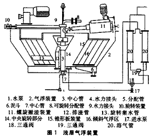 原水通過泵1進入氣浮裝置2的中心管3,通過可旋轉的水力接頭4和可旋轉的分配管5均勻地配入氣浮池底部,溶氣水經過中心管7進入可旋轉的分配管8,與原水同步進入氣浮池底部。9亦為一個可旋轉的水力接頭。飽含微氣泡的溶氣水與原水在氣浮裝置的底部充分碰撞、粘附,使原水中的微粒形成比重<1的浮渣上升到水面而被除去。原水的分配管5和溶氣水的分配管8被固定在同一旋轉裝置10上,其旋轉方向與原水進入氣浮池底部的水流方向相反,但速度相等。本裝置的關鍵部分是成功地利用“零速度”原理,使進水對原水不產生擾動,固液分離在一種靜態下進行。 表面形成的浮渣層由螺旋撇渣裝置11收集,然后經過排渣管12將其排到池外。澄清后的水由旋轉集水管13收集后排到池外,集水管13與中央旋轉部分14連在一起,這樣原水在氣浮池中的停留時間就是中央旋轉部分的回轉周期。 連在旋轉行走裝置上的刮板將池底和池壁上的沉泥刮到泥斗6中,定期排放。 另外一項重要的改進就是固定在旋轉行走架10上相互之間有一定間距的一組同心錐形板裝置15,與配水部分一起沿氣浮池同步旋轉。每相鄰兩塊錐形板組成一個傾斜的環行氣浮區域16,該區域內水時刻處于層流狀態,加速了顆粒雜質隨微氣泡的上升速度。 淺層氣浮裝置還包括一對并聯運行的溶氣管20(簡稱ADT’S),進水泵17的壓力較低,只需202.6 kPa。進水首先通過與兩個ADT’S連接的三通閥18,ADT&rsqu
