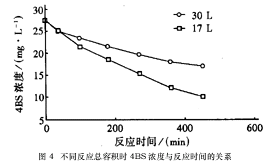 從表4可以看出,循環流量對光催化降解脫色速率幾乎沒有影響,這表明在光催化反應器系 統中可忽略溶質向催化劑表面的傳質影響。這是因為在流化床光催化反應器中,循環流量一般較大,以使反應器中有效區內的負載催化劑達到充分的流化。 2.6 應系統中無效容積的影響 在2.2節的條件下,反應系統中無效容積對4BS(溶液濃度為27mg/L)降解脫色效果的影響見圖4。